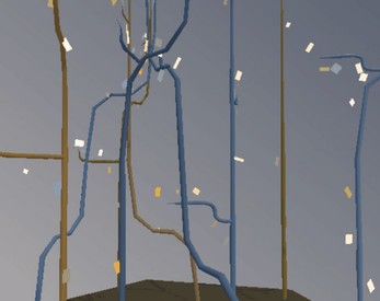 It's basically just stringing a few simple Bezier curves together and generating a cylinder mesh along those paths. (The leaves are just flat, colored planes here). There's quite a bit more going on under the hood than shown here, so I hope to add more scenes.